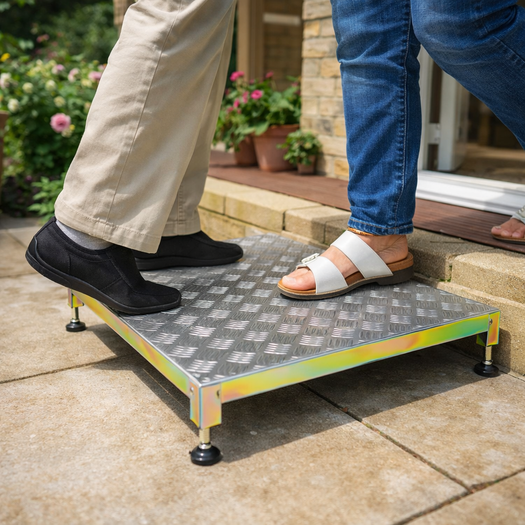 Our adjustable metal half step is designed to provide a safer and more convenient step up for individuals with mobility needs. Featuring a chequered design, this step is suitable for both domestic and commercial environments.