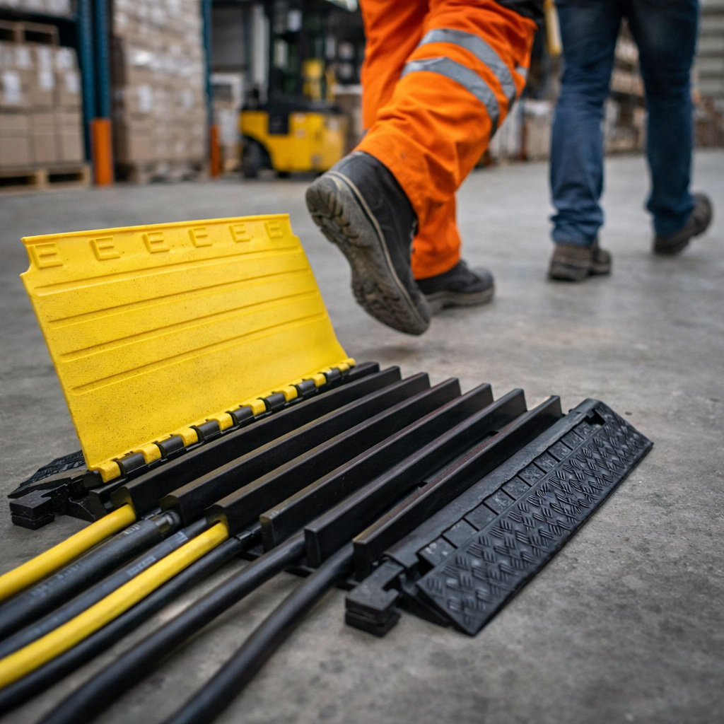 This heavy-duty cable protector is designed to handle vehicle traffic with ease. It features five channels to organize and protect your cables effectively. The yellow tinted, non-slip lid provides added safety, while the interlocking design ensures robust connectivity. Made from recyclable polyurethane, this cable protector is not only durable but also environmentally friendly.