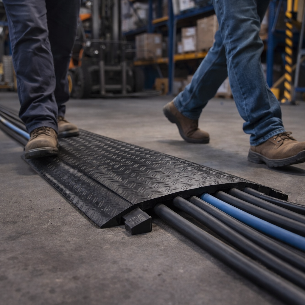 This robust cable protector is designed to safeguard cables and hoses in high-traffic areas. Perfect for both indoor and outdoor settings, it features a non-slip surface and is made from recyclable polyurethane with a secure locking lid.
