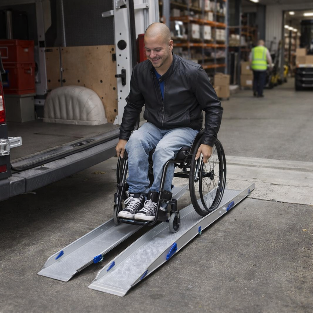 These folding channel ramps are designed for easy wheelchair access over kerbs and single steps. With a lightweight yet strong aerospace technology construction, they offer a maximum load capacity of 400kg.