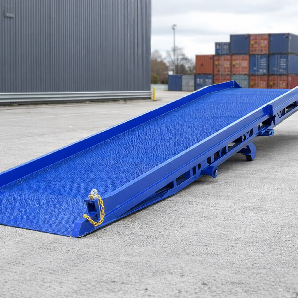 This extra wide industrial yard ramp enhances the ease of loading wider machinery. Simplifying the loading and unloading of containers, its fixed swivel clamp allows easy movement with a forklift, while the hydraulic assist enables effortless height adjustments.