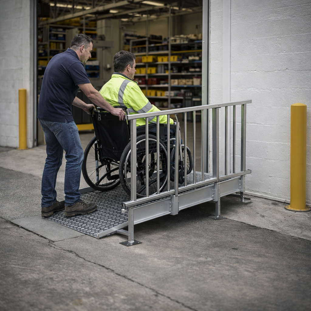 Our Modular Ramp Kit, measuring 1100mm wide and 1360mm long, features an internal width of 877mm. It includes balustrade handrails and an anti-slip mesh surface, ensuring safety and reliability. This ramp is designed for temporary and portable use, not requiring compliance with building regulations Part M or Part K.