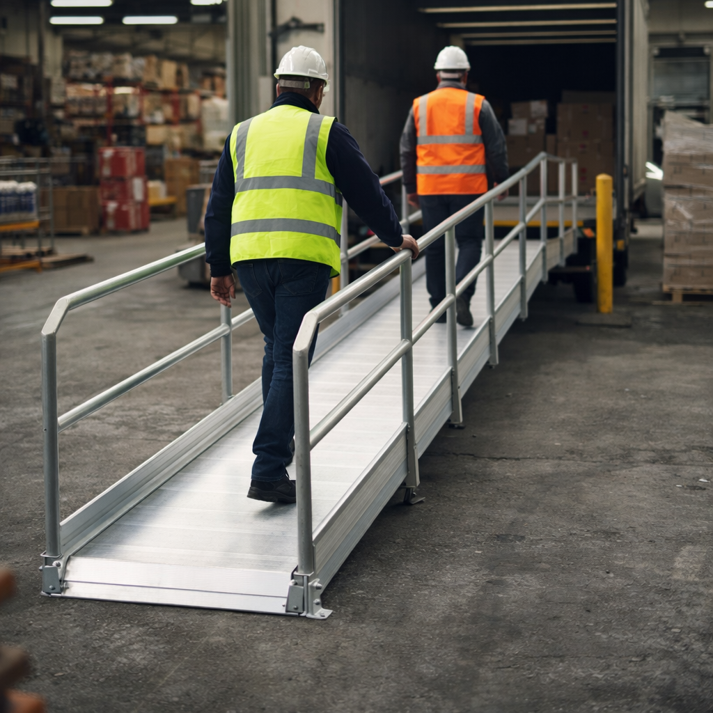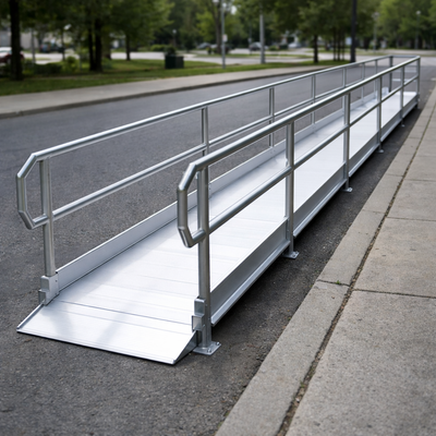 Our pedestrian ramp with folding handrails is designed for overcoming architectural barriers such as steps, thresholds, or kerbs in both private and public settings. This ramp offers a non-slip transit surface with R12 slip resistance, ensuring safety and ease of use.