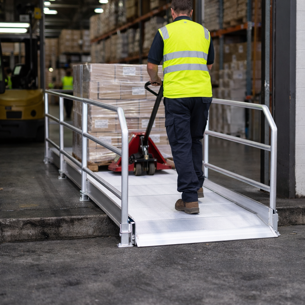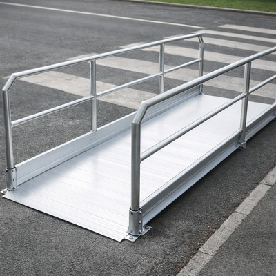 These pedestrian ramps with handrails offer a reliable solution for overcoming architectural barriers such as steps, thresholds, or kerbs in both private and public settings. They are designed with a non-slip transit surface featuring R12 slip resistance, making them perfect for safe and secure access.