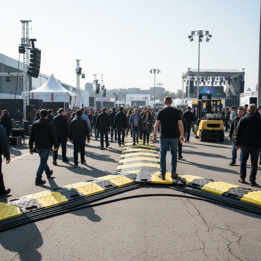 The Premium 3 Channel Cable Protector Ramp is a high-performance solution designed to accommodate heavy goods vehicle (HGV) traffic with an axle weight capacity of up to 10 tons. This cable ramp is essential for protecting cables or hoses that cross areas with vehicle traffic, making it an ideal accessory for construction sites, music events, and road works.