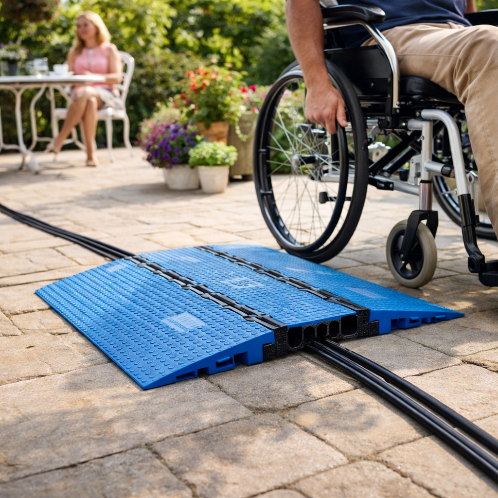 This heavy-duty cable protector set is designed for safe and convenient access for wheelchairs, rollators, walkers, trolleys, and more. Made from extremely robust and break-proof TPU, it features a heavy-duty all-round cable bridge with a 3D laser grip anti-slip surface made of blue recycled polyurethane and a patented self-cleaning lid hinge for enhanced safety.